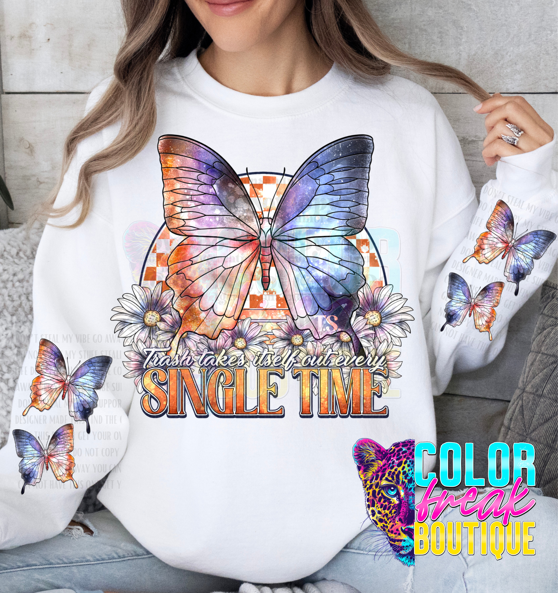 Introducing our Trash Takes Itself Out Sweatshirt - the ultimate uplifting and empowering addition to your wardrobe! With a bold and bright butterfly design, this sweatshirt comes with matching sleeve options for a unique and stylish touch. Let your outfit inspire change and positivity!