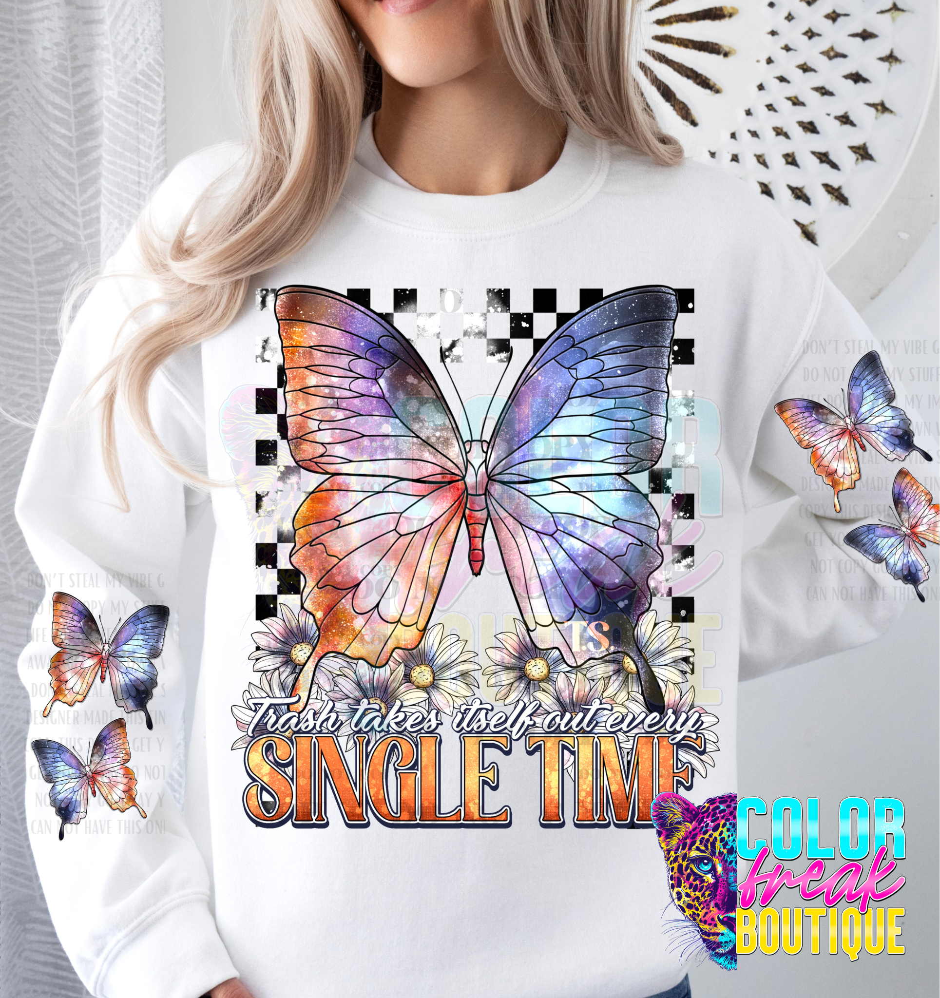 Introducing our Trash Takes Itself Out Sweatshirt - the ultimate uplifting and empowering addition to your wardrobe! With a bold and bright butterfly design, this sweatshirt comes with matching sleeve options for a unique and stylish touch. Let your outfit inspire change and positivity!